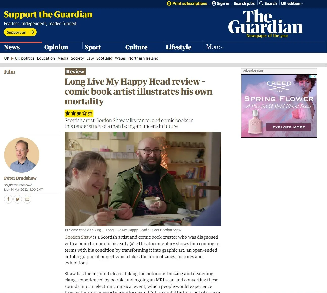 “Funny, poignant, and profound, Long Live My Happy Head introduces us to the unique talent, understated wit, and unenviable journey of Gordon Shaw, a Scottish comic book artist who is diagnosed with an inoperable brain tumor in his early 30s. Not the least bit self-pitying but with puckish humor and admirable honesty, Gordon allows the film to accompany him and his long-distance true love Shawn—a sweet American living in Virginia—as they navigate the fragile rollercoaster of health challenges and caregiving amid the onset of COVID.